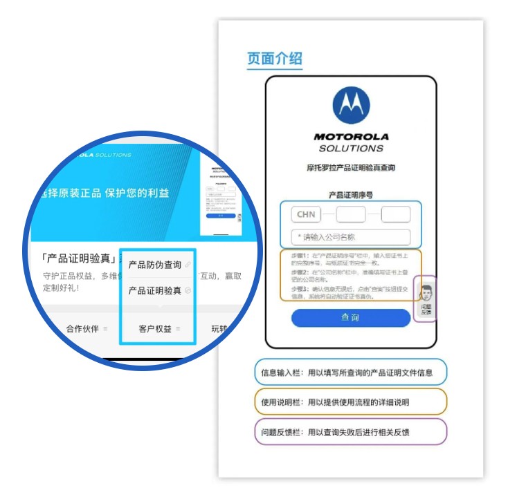 使用步骤超简单:关注“摩托罗拉系统”微信公众号,点击菜单栏【客户权益】>【产品证明验真】,按页面提示填写信息,输入证书左上角的完整序号及公司名称,系统将自动核验文件是否为伪造文件。