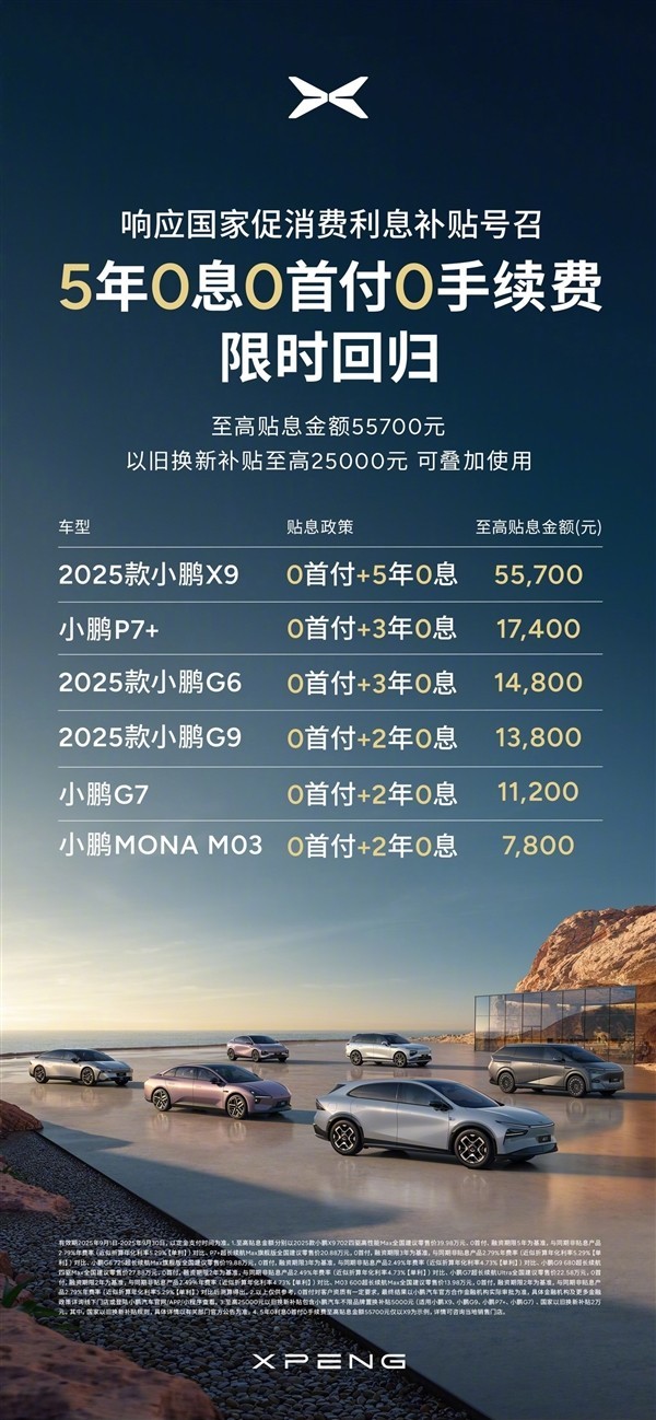 2025 款小鹏 X9:可享 0 首付 + 5 年 0 息,至高贴息 55700 元。