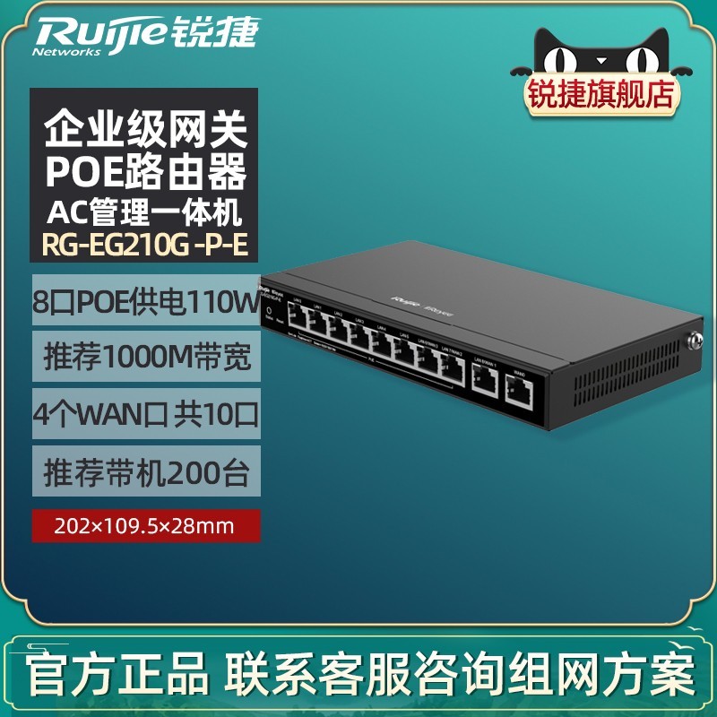锐捷RG-EG210G-P-E千兆企业级路由器集网关、无线AC控制器、POE供电于一体,专为中小型企业、商铺、办公网络设计,搭载双WAN口负载均衡技术,提升网络稳定性和带宽利用率,8个千兆POE端口可直接为AP、摄像头等设备供电,大幅简化布线。内置智能流控和安全防护功能,有效管理网络流量,保障业务流畅运行。支持集中管理多台AP,实现无缝漫游与统一配置,运维更高效。