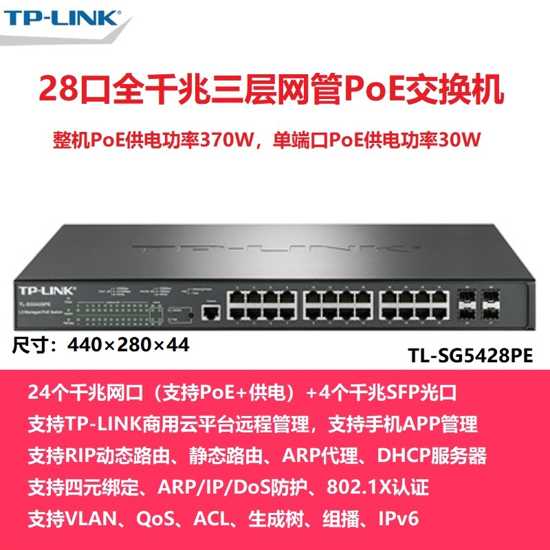TP-LINK推出的TL-SG5428PE交换机是企业监控和无线AP供电的好帮手。它拥有24口PoE+4SFP光口,具备全千兆24口POE供电和4光口,支持三层云网管,功率达370W。