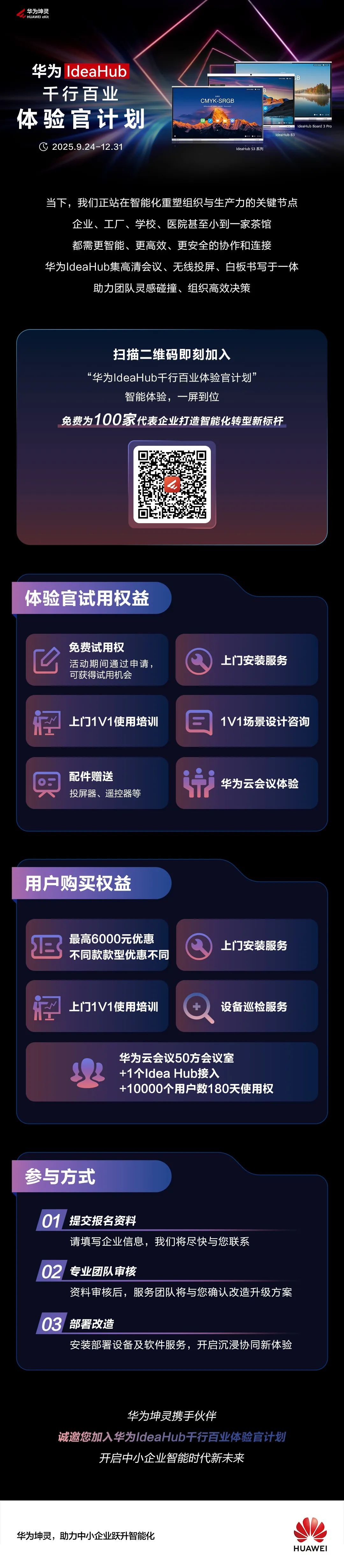 企业、工厂、学校、医院甚至小到一家茶馆都需更智能、更高效、更安全的协作和连接华为ldeaHub集高清会议、无线投屏、白板书写于一体助力团队灵感碰撞、组织高效决策