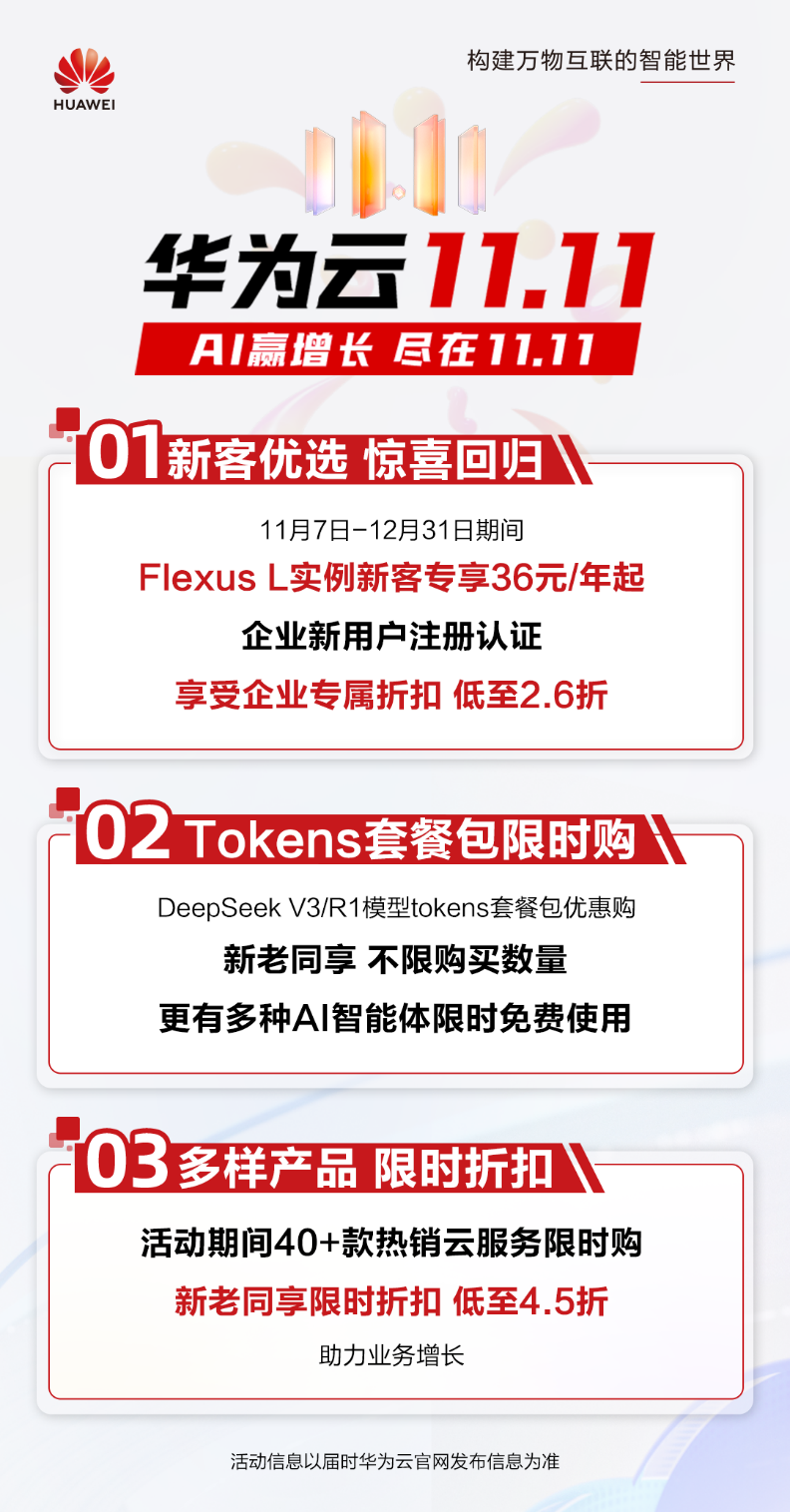 在数字经济的澎湃浪潮中,AI能力已从可选项演进为企业发展的核心支撑,它不仅是提升效率的利器,更是企业破解增长瓶颈、构筑核心竞争力的关键引擎。为助力企业在数字洪流中破浪前行,11月7日至12月31日,华为云11.11活动正式开启。此次活动以“AI赢增长,尽在11.11”为主题,华为云携全栈产品矩阵与专属方案重磅来袭,助力千行万业乘云而上,解锁企业智能增长新可能。