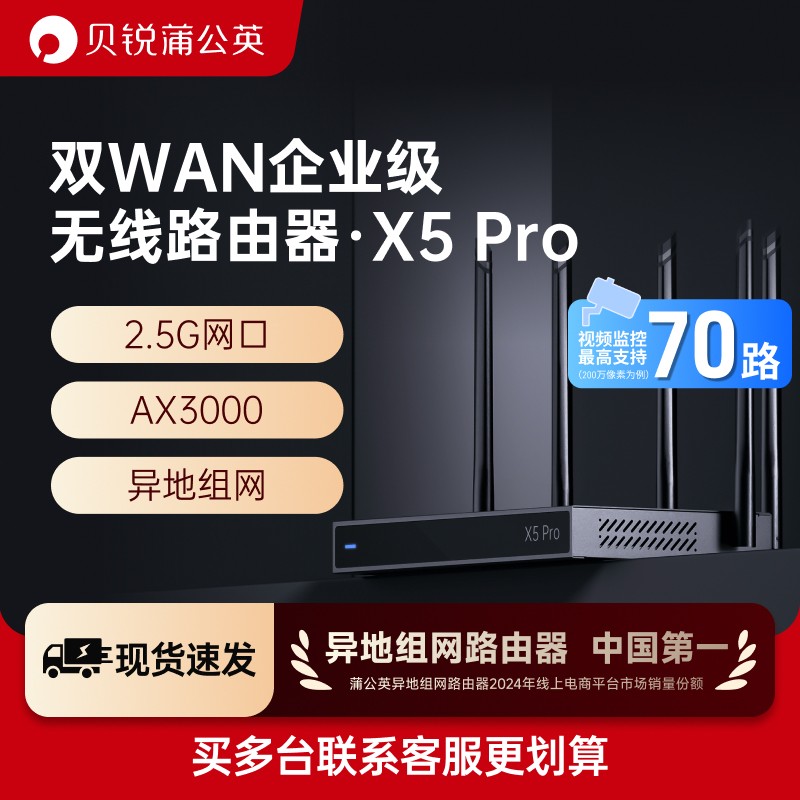 蒲公英企业级软路由器X5Pro双WAN口2.5G千兆AX3000双频WiFi6支持异地组网内外网穿透医保专线NAS视频监控远程访问,高性能配置满足企业多场景联网需求,双WAN口设计提升网络稳定性,支持2.5G高速传输,搭载WiFi6技术实现更快的无线连接速度与更强的设备承载能力,轻松应对远程办公、数据监控、医疗系统专线接入等复杂网络环境。
