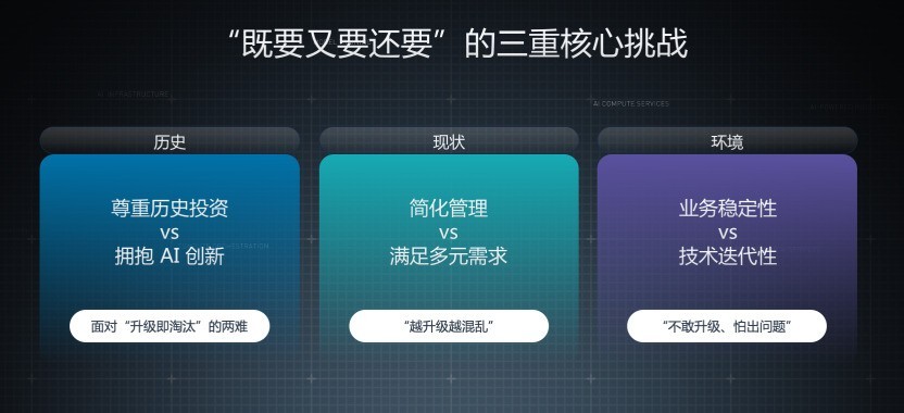 这并非易事,企业在数智化转型过程中,正深陷“既要又要还要”的三重核心挑战:其一,从历史维度看,既要尊重历史投资,又要主动拥抱AI创新,不得不直面“升级即淘汰”的两难境遇;其二,聚焦当下现状,技术团队既要简化管理,又要满足多元需求,进而导致IT越升级越混乱;其三,着眼大环境,企业既要保障业务稳定性,又要技术能够持续迭代升级,双重压力下,陷入“不敢升级、怕出问题”的困境。