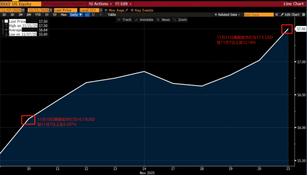 2025年第三季度财报发布后,贝壳股价表现强劲。自11月10日财报公布以来,截至11月21日,其美股累计涨幅超过12.2%。在随后的10个交易日中,有8个交易日实现上涨。在房地产市场整体波动的背景下,资本市场以实际交易表达了对贝壳未来成长性的认可。
