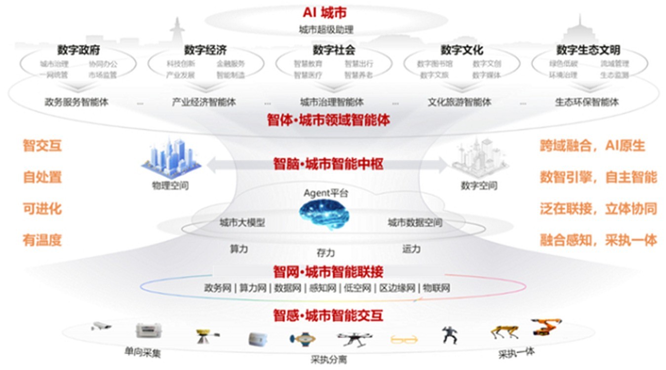 通过以上四个维度的跨越式发展,AI CITY构建起“善感知、会思考、有温度、自进化” 的智能形态。它以“城市领域智能体”“城市智能中枢”“城市智能联接”“城市智能交互”的垂直贯通为核心架构,形成“自我感知-动态推演-精准执行”的完整运转闭环。这一架构不仅为城市全域数字化转型提供了坚实支撑,推动治理、服务、运行等各环节的系统性升级,更从技术创新与场景适配层面,为城市智能化演进持续注入鲜活动能。