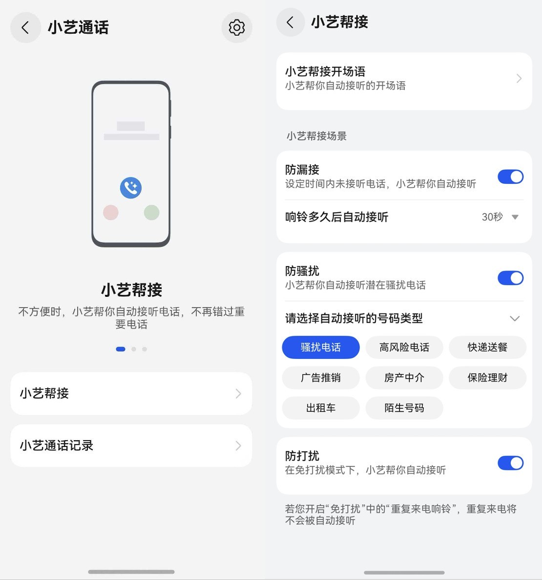 用户只需在“设置”中点击“小艺”,选择“小艺通话”,即可在“小艺帮接”中设置开场语、防漏接、防骚扰、防打扰等。小艺通话还支持通过“小艺通话记录”随时查看、智能摘要,不错过重要来电。